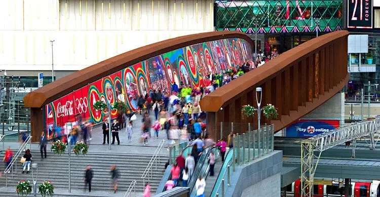 For the London 2012 Olympic Games, I helped design a large-scale graphic installation spanning both sides of a 100-meter pedestrian bridge. Sustainable graphic cladding transformed the structure into a dynamic storytelling surface featuring imagery captured during the Olympic Torch Relay. The installation became a prominent Coca-Cola brand moment during the Games.